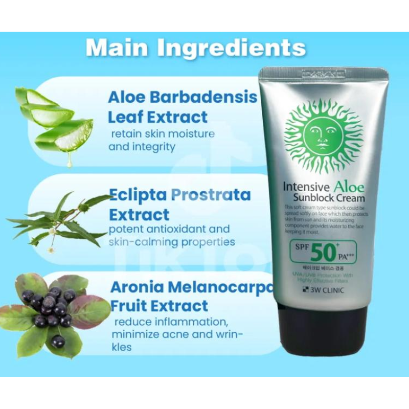 Сонцезахисний крем Aloe Sunblock Cream SPF 50+PA+++ - поєднує в собі надійний захист від UVA/UVB-променів та глибоке зволоження, ідеально підходить для щоденного користування. Формула містить високий рівень захисту SPF50+ PA+++, який ефективно нейтралізує негативний вплив сонячного випромінювання, при цьому запобігає появі пігментних плям, почервонінню та сонячним опікам. В складі є сік алое вера, який відомий заспокійливими, зволожувальними та протизапальними властивостями. Алое вера допомагає регулювати виділення шкірного жиру, зменшує блиск, сприяє швидкому загоєнню після акне, а також підтримує оптимальний водний баланс шкіри. Червоний женьшень - активізує природні процеси регенерації та підвищує її стійкість до впливу навколишнього середовища. Вітамінний комплекс засобу робить крем живильним, стимулює регенерацію клітин та покращує загальний стан шкіри. Крем проявляє антивіковий ефект, сприяє зменшенню зморшок і підтримує природне сяйво шкіри. Засіб від 3W Clinic проявляє свою стійкість до води та поту, ідеальний в умовах активного відпочинку.