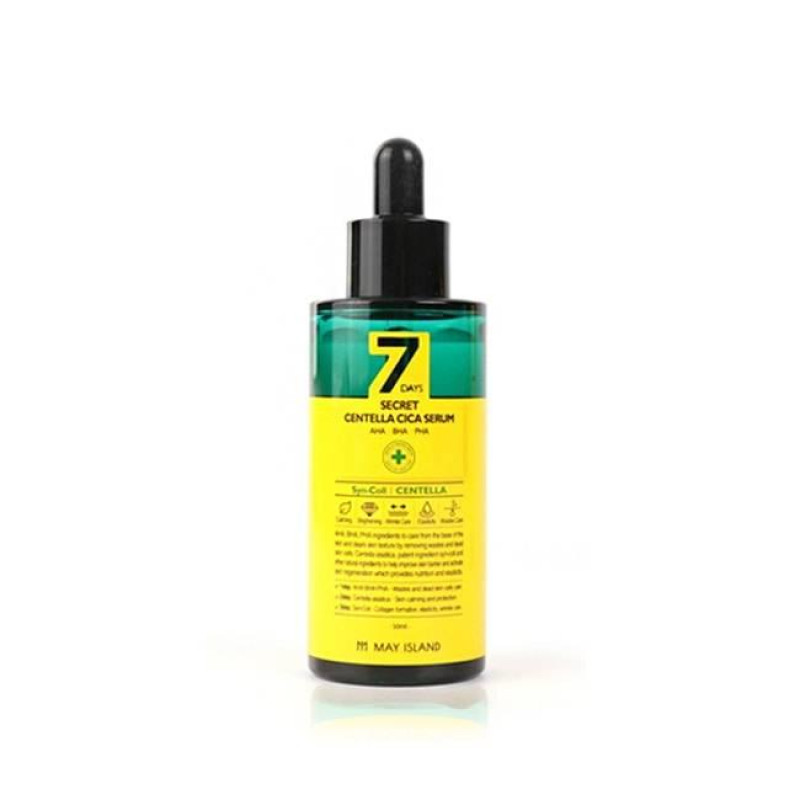 Сироватка для обличчя May Island 7 Days Secret Centella Cica Serum - активний засіб для боротьби з акне, комедонами та підвищеною жирністю шкіри. Вона відлущує ороговілі клітини, знімає запальні процеси, прискорює загоєння, нормалізує виділення шкірного жиру, вирівнює рельєф та тон дерми.