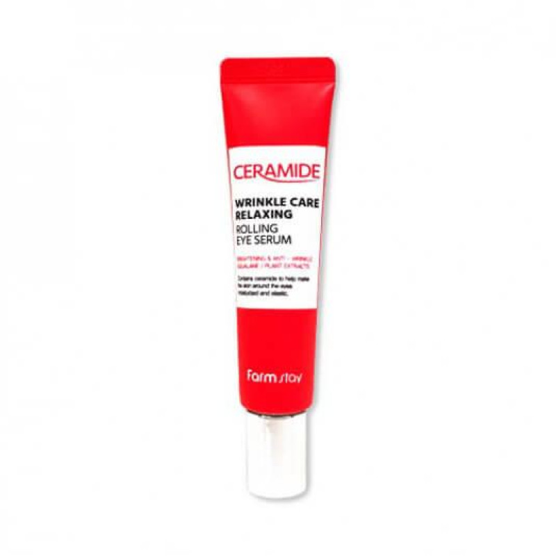 Сироватка-ролер Ceramide Wrinkle Care Relaxing Rolling Eye Serum FARM STAY - має гелеву текстуру, на аплікаторі знаходяться три маленькі кульки, що прискорюють процес нанесення та проникнення сироватки в шкіру. Засіб розроблений для ефективного омолодження зони навколо очей.