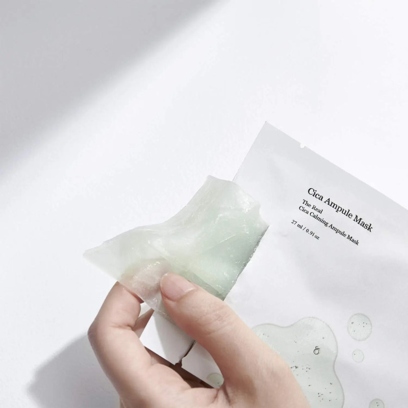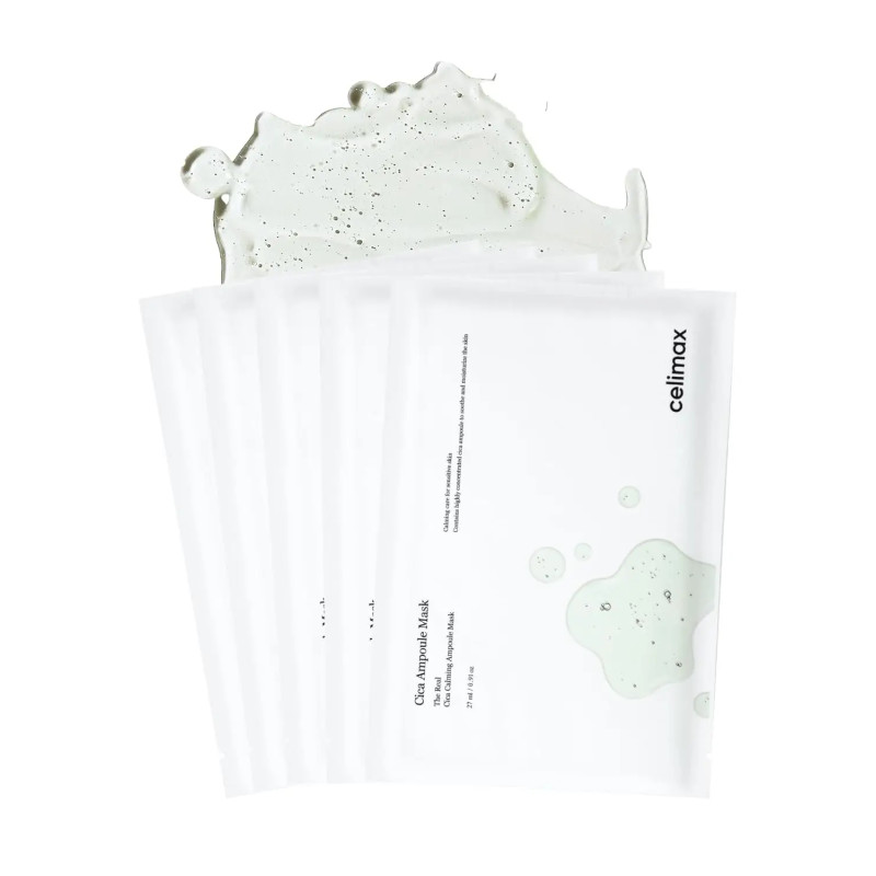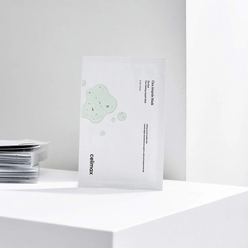 Маска The Real Cica Calming Ampoule Mask - засіб створений спеціально для догляду за подразненою, запаленою і чутливою шкірою. В складі є екстракт центели азійськой, яка заспокоює проблемні ділянки шкіри та зменшує запалення. Комплекс із 3 видів гіалуронової кислоти - відновлює вологий бар'єр шкіри, забезпечуючи додатковий захист від агресивного впливу зовнішнього середовища. Маска глибоко зволожує та насичує шкіру, зменшує чутливість, має протизапальну дію, вирівнює тон і покращує текстуру шкіри. Матеріал маски щільно прилягає до обличчя, інтенсивно зволожує і пом'якшує шкіру, залишаючи відчуття свіжості і комфорту. Маска від Celimax заспокоює шкіру, знімає почервоніння, подразнення і сприяє регенерації клітин.