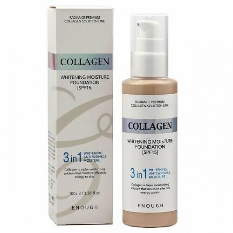 Тональний крем Collagen Whitening Moisture Foundation SPF 15 - унікальний засіб, який має потрійну дію, допомагає створити бездоганний макіяж і приховати всі недосконалості шкіри. Він відмінно підлаштовується під ваш відтінок шкіри, не закупорює пори, робить шкіру приємною на дотик, не створює ефект маски.