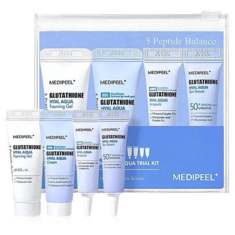 Medi-Peel Glutathione Hyal Aqua Ampoule: Purified Water, Butylene Glycol, 1,2-hexanediol, Glycerin, Niacinamide, Hydrogenated Coconut Oil, Hydrolyzed Sodium Hyaluronate (9749 Ppm), Cetearyl Alcohol, Glutathione (6000 Ppm), 2-polyglyceryl-10 Stearate, Cetearyl Livate, Methyl Glucose Sesquistearate, Isoamilaurate, Carbomer 700 Parts Per Million), Hyaluronic Acid (700 Parts Per Million), Xanthan Gum, Pentylene Glycol, Adenosine, Dysodium Dithiae, Maltodextrin, Gardenia Extract, Glycerin, Sea Buckthorn, Polyglyceryl-10 Laurate, Dimethylsilanolhyaluronate (300 Parts Per Billion), Copper Tripeptide-1, Acetylhexapeptide-8, Cyanocobalamin, Palmitoyltetrapeptide-7, Palmitoyltripeptide-1, Palmitoylpentapeptide-5. 0 Ppb), Potassium Hyaluronate (35 Ppb), Acetylated Sodium Hyaluronate (15 Ppb), Riboflavin, Flavoring, Citronellol, Geraniol, Hexylcinnamal, Hydroxycitronellal, Limonene, Linalool.