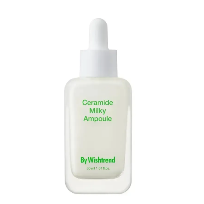Ампула Ceramide Milky Ampoule - створена для активної боротьби з сухістю та лущенням шкіри, інтенсивно зволожує епідерміс, а також насичує його корисними компонентами. Сироватка відновлює ліпідний бар'єр і зміцнює природні функції шкіри. Спочатку засіб знімає подразнення, а потім укріплює її бар'єр. В складі є 69% екстракту центели азійської, 7 типів пептидів і рослинний сквалан, які комплексно заспокоюють, зміцнюють та глибоко відновлюють шкіру. Ампула зміцнює епідерміс, зменшує чутливість та укріплює стінки капілярів. Стимулює синтез колагену та еластину, покращує пружність шкіри і уповільнює процеси старіння. Потужний комплекс проявляє і заспокійливу дію знімає свербіж і подразнення, вирівнює рельєф і пом'якшує загрубілі ділянки тіла. Засіб від By Wishtrend має легку молочну консистенцію, і рекомендується для сухої, чутливої та зневодненої шкіри.