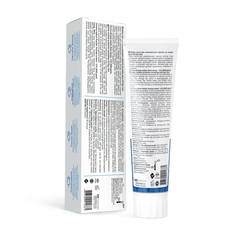 Зубная паста для комплексной защиты на каждый день All-Day Care Medosan сочетает глубокую очистку, мягкую заботу об эмале и длительную свежесть. Основа формулы – увлажняющая база с сорбитом, обеспечивающая комфортное нанесение и нежную кремовую текстуру. Очищающий компонент на основе увлажненного кремния работает как деликатное полировочное средство: он удаляет налет, уменьшает тусклость и помогает вернуть естественную гладкость зубов без риска повреждения эмали.