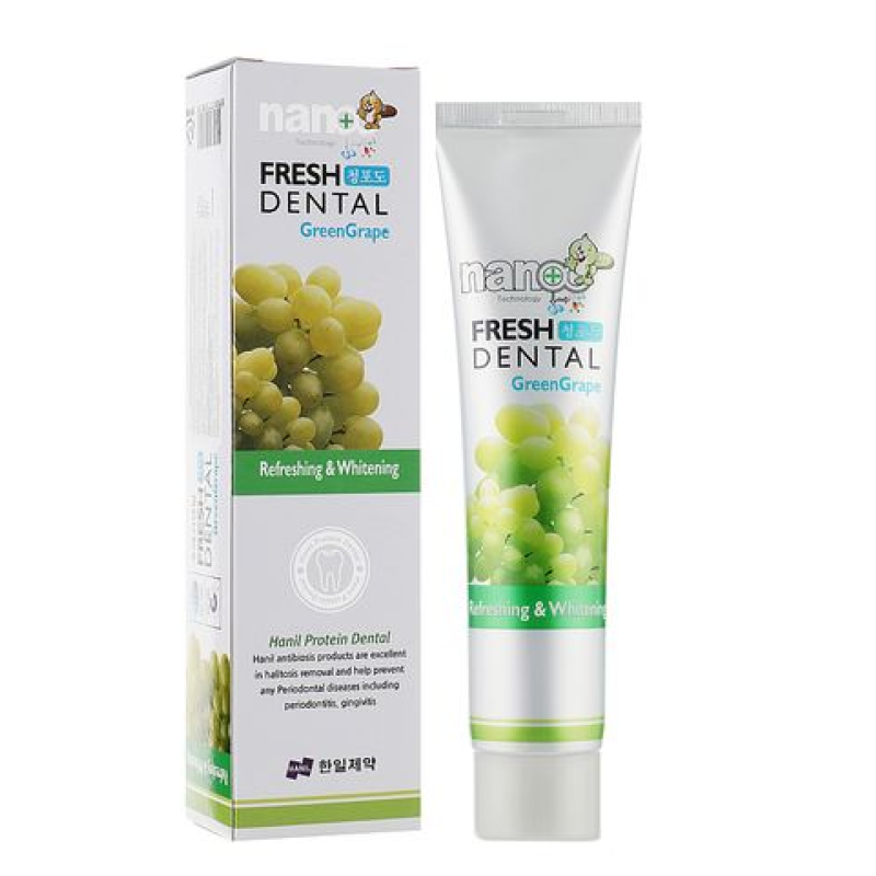 Зубная паста FRESH DENTAL Green Grape предназначена для ежедневного ухода за полостью рта. Она обеспечивает эффективное отбеливание зубной эмали без повышенной чувствительности, глубокое очищение и профилактику образования зубного камня. В составе есть экстракт зеленого винограда - способствует восстановлению естественной бактериальной микрофлоры полости рта и проявляет защиту от воспалений. Частицы серебра - активно борются с размножением вредных бактерий, обеспечивая дополнительную антибактериальную защиту. Паста от Hanil гарантирует свежее дыхание, удаление налета и антибактериальную защиту.