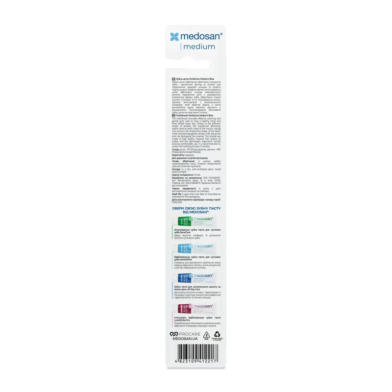 Зубная щетка SmileCare Medium Blue Medosan для тех, кто ценит сочетание эффективности, комфорта и аккуратного ухода за улыбкой. Ее средняя жесткость является универсальным вариантом для ежедневной очистки: щетинки достаточно упругие, чтобы тщательно устранять налет, но в то же время деликатные к деснам, не создают раздражения и подходят для большинства типов зубов.